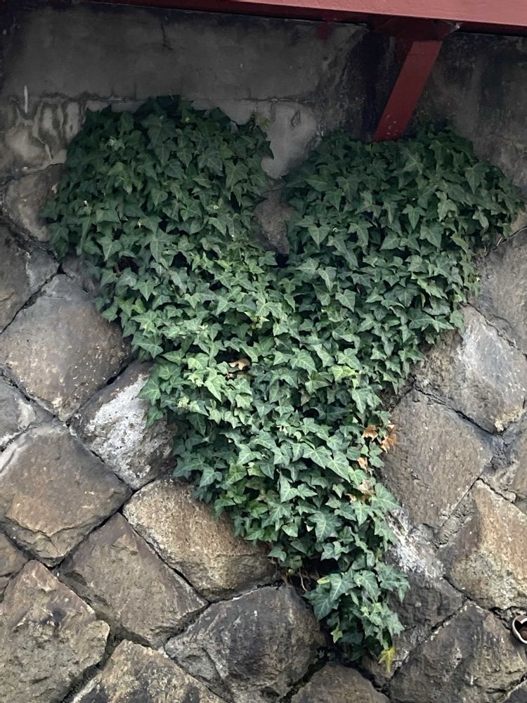 ①線路脇の石壁にハート形のアイビーが絡まってます。