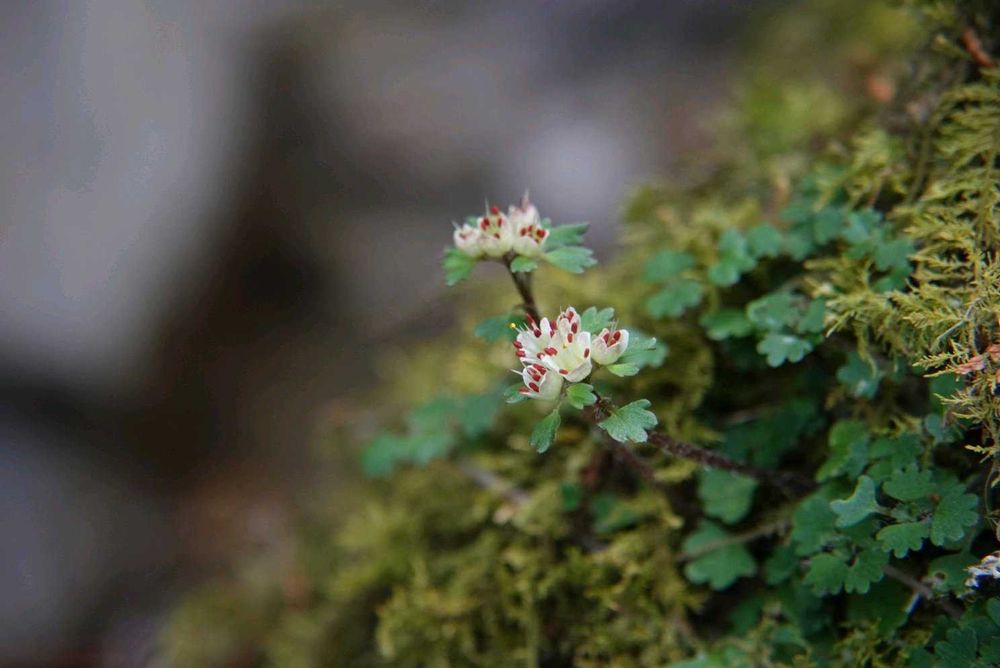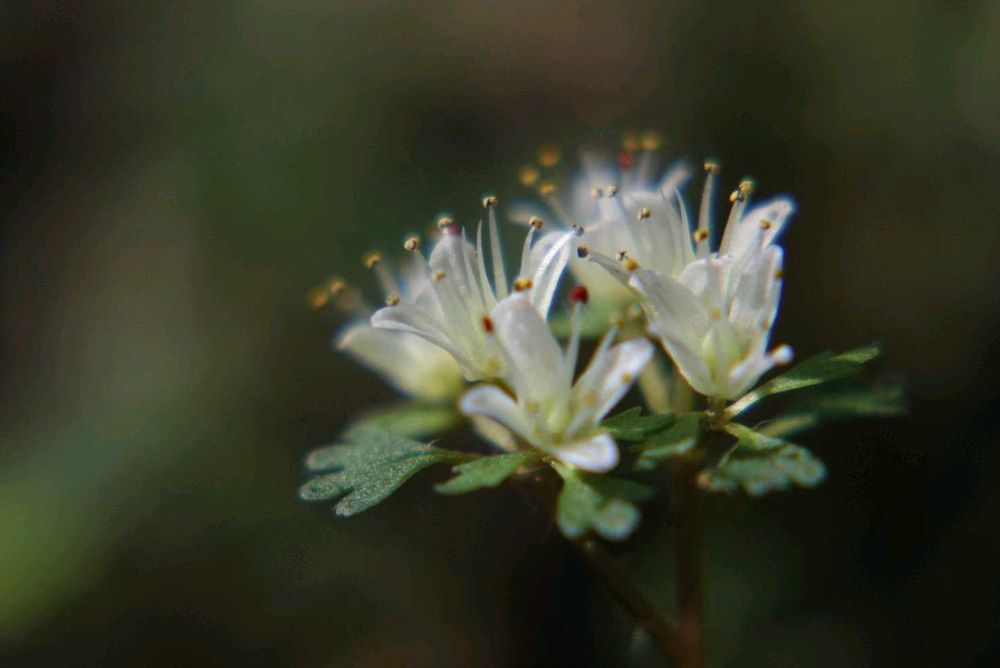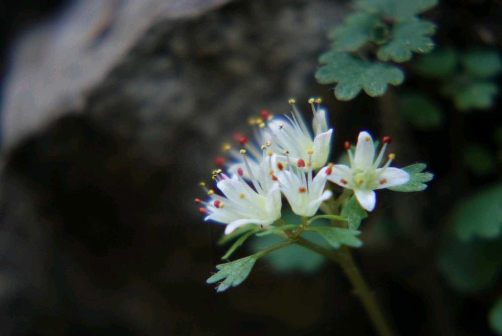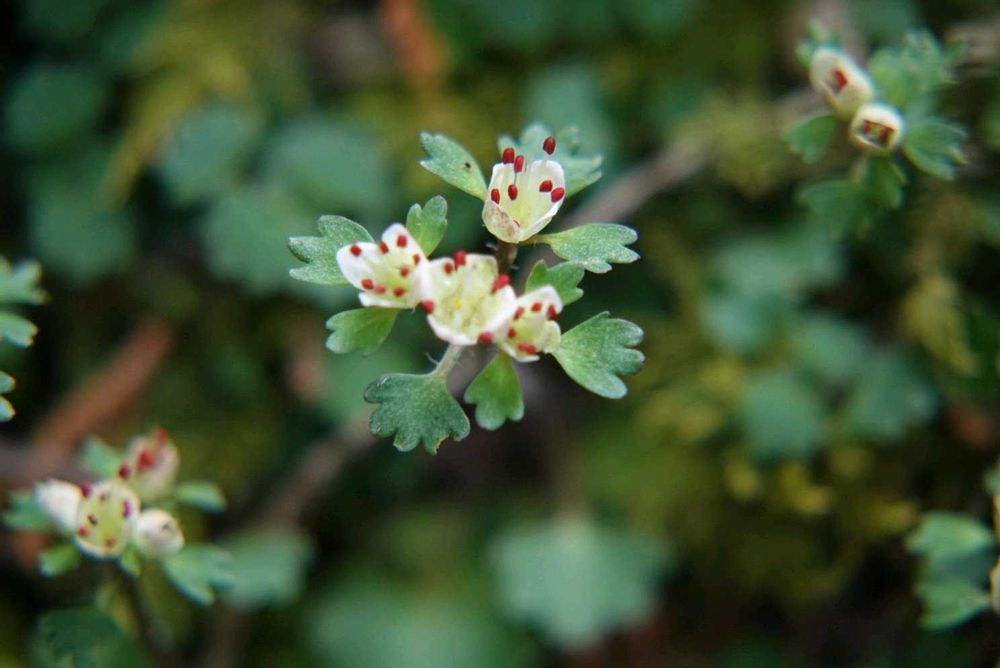 白い花弁に見えるのは萼片で5㍉程の大きさの花。雄しべが紅く、白と赤のコントラストが美しい。