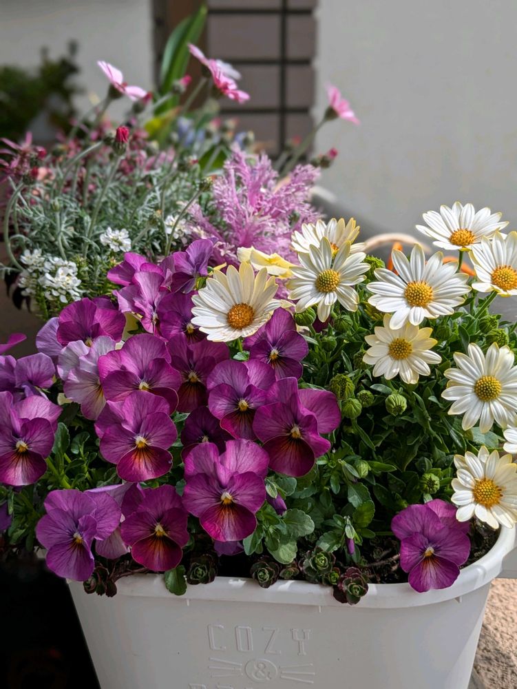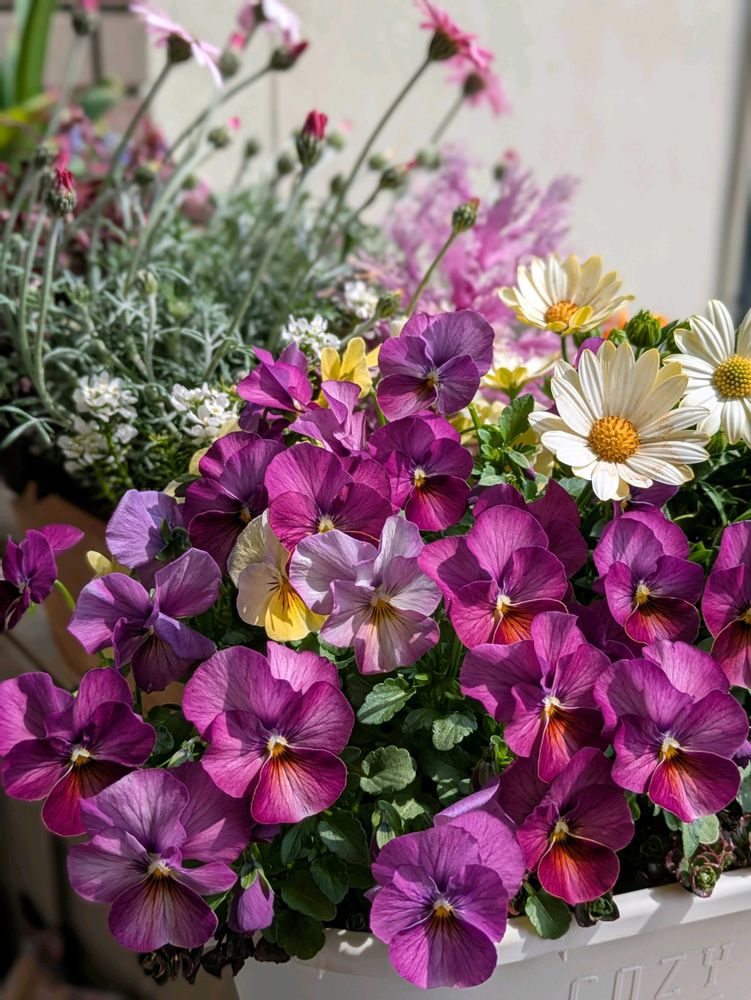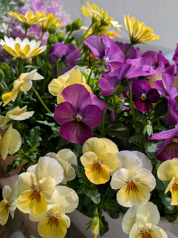 イエローのビオラにしてみたら、目の前のパープルのビオラは、壁!!