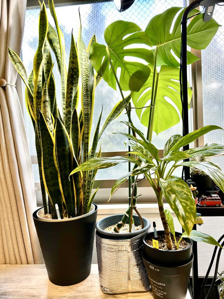 西陽が眩しい日光浴😊モンステラ初号機😊サンセベリアローレンチー😊アグラオネマブリリアントトリカラー😊