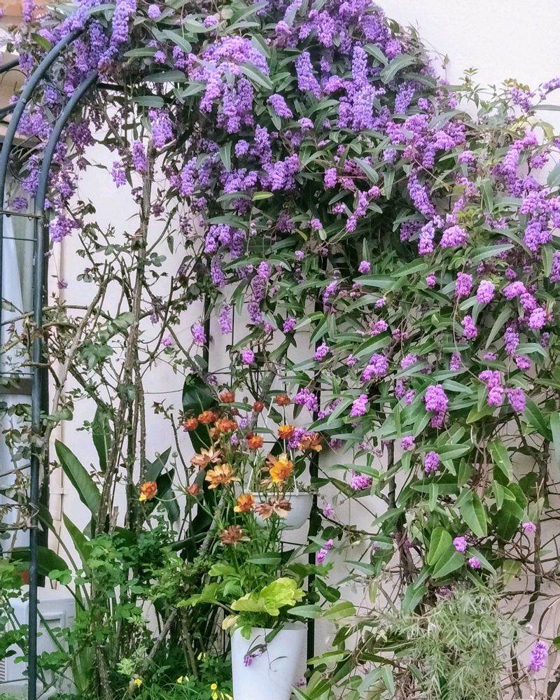 薔薇のアーチを占領してきているハーデンベルギアさん(✿ ♡‿♡)