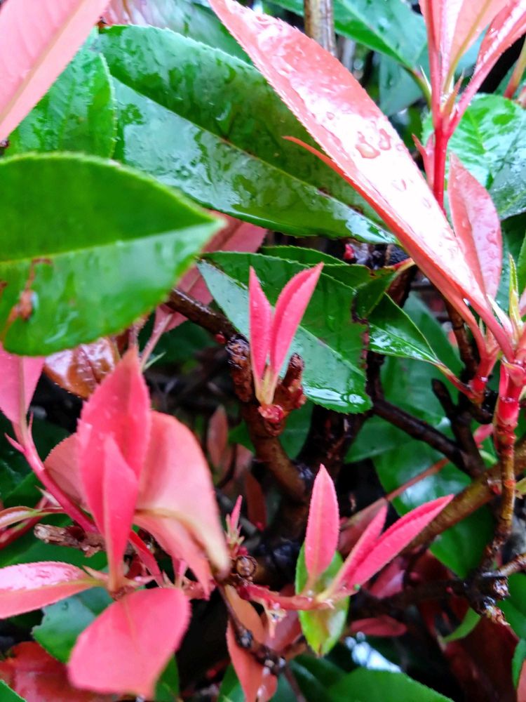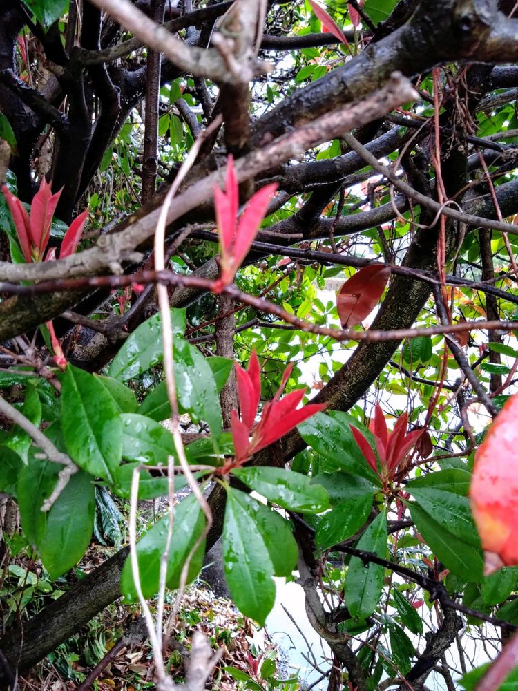 近所中、生垣とかでよく見かけて、特に春先は赤い葉が目立ちます。正直、あまり好きな樹木ではなかったのですが、GSで新芽について投稿されている方がいらっしゃって、新芽探しは新鮮でした。
