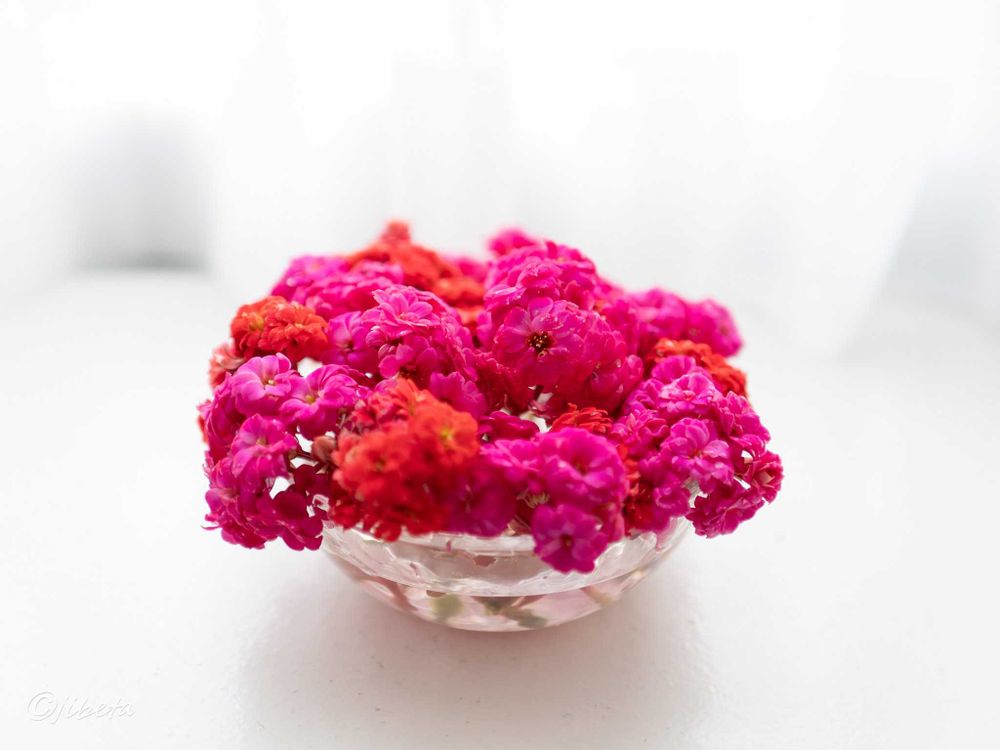 八重のカランコエ2品種が咲き切ったので、ガラス容器に活けました。