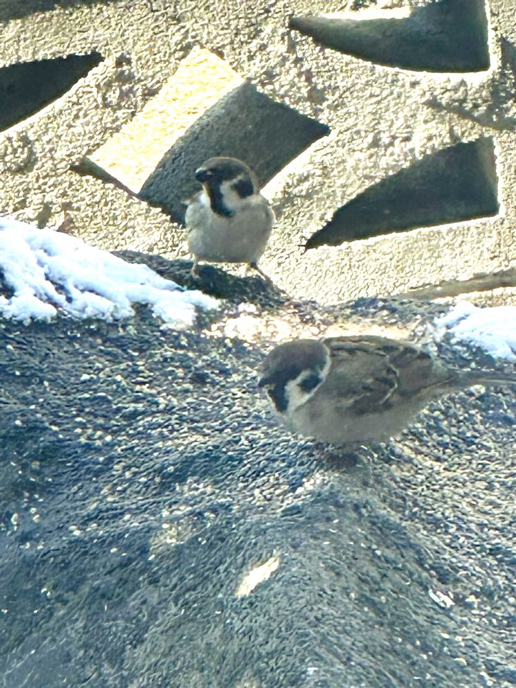 スズメちゃん達が雪が解けたらすぐにエサを啄みに来ましたよ🐧🐧
