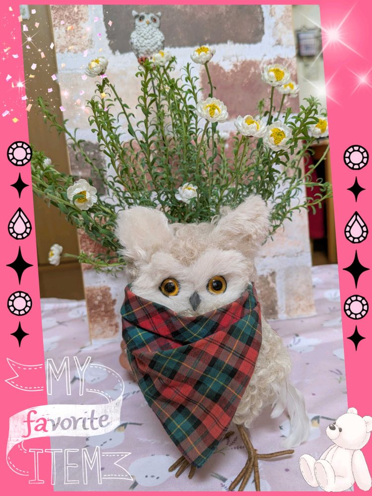いちごみるくちゃんが贈ってくれたミミズクサンに、マロ🌈のバンダナを巻いて…
