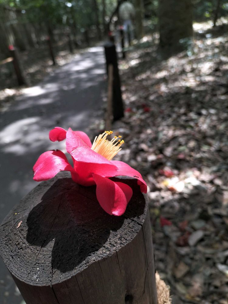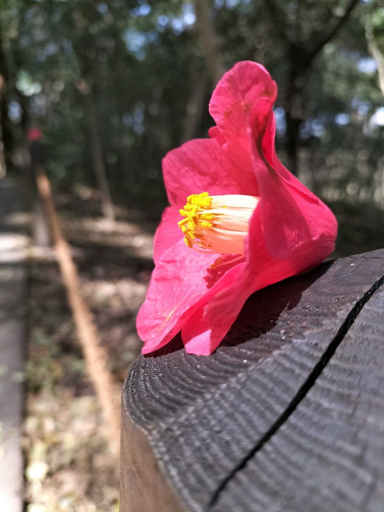 そこの裏小径(こみち)を歩いていると、子供さんの仕業なのか柵棒の上にツバキが置いてありました。一本だけでなくほぼ全部の上にあるので微笑ましくなっちゃって。