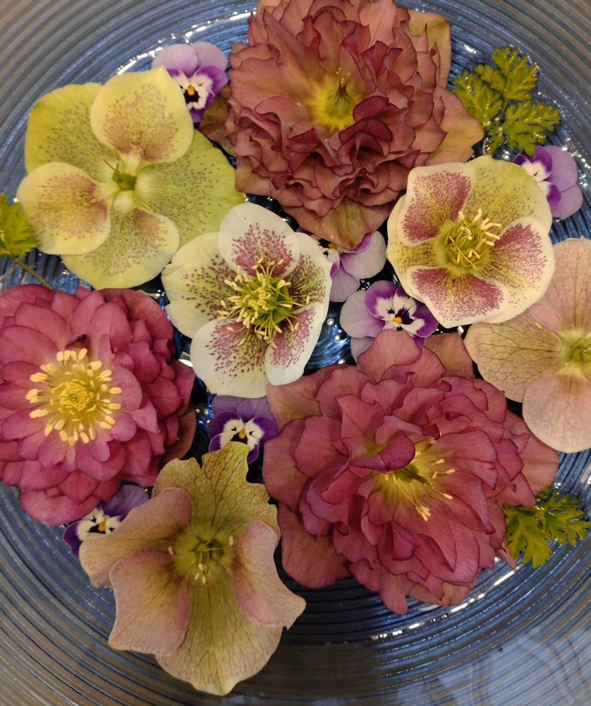 色とりどりのクリスマスローズ、パンジー