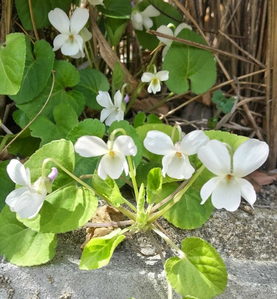 石垣の上、歩道に向いて花を咲かせる白いスミレ。