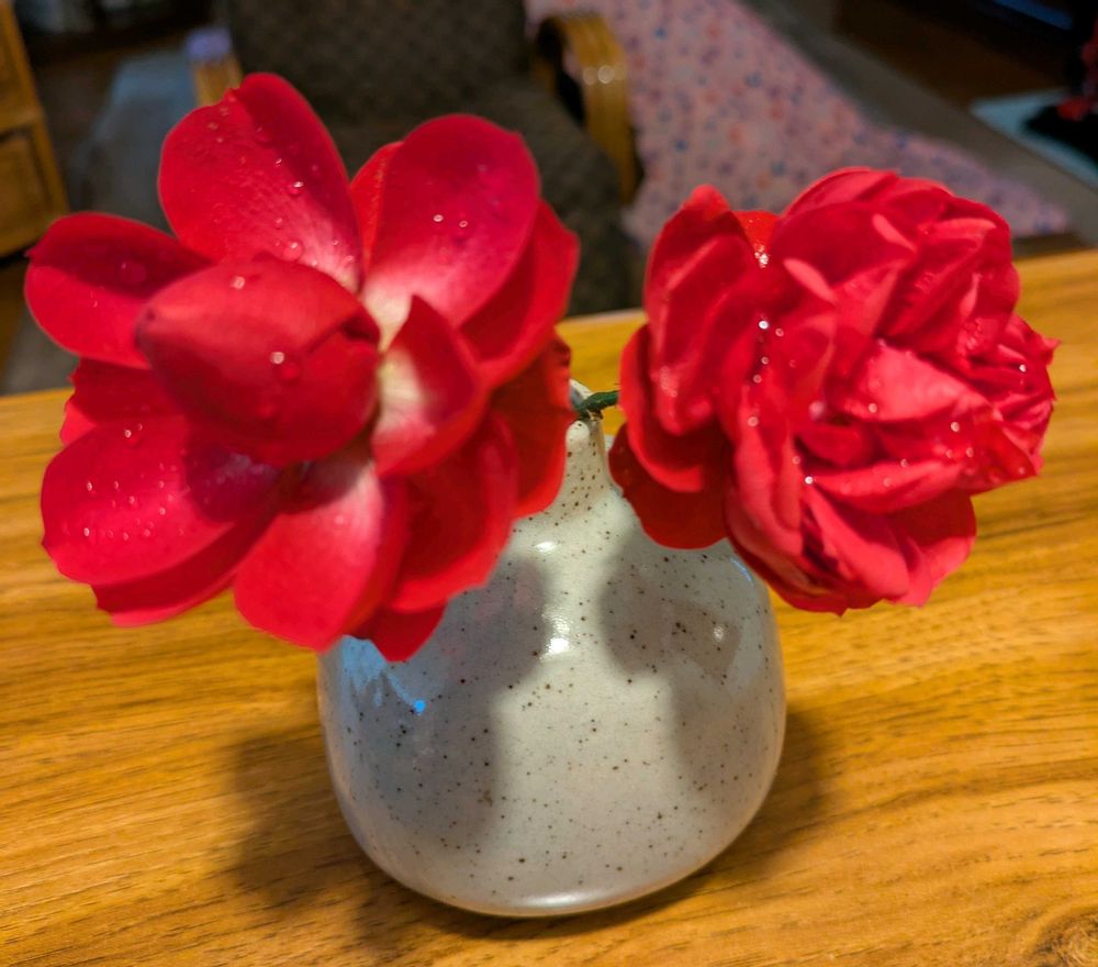 外は雨。花粉が少ないので終わった花をカットして来た。少し剪定も。この子たちは、うなだれていたのでお部屋に。まだ水滴💧がついている。