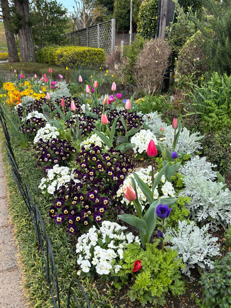 ビオラの色で花壇の雰囲気が全然違いますねー