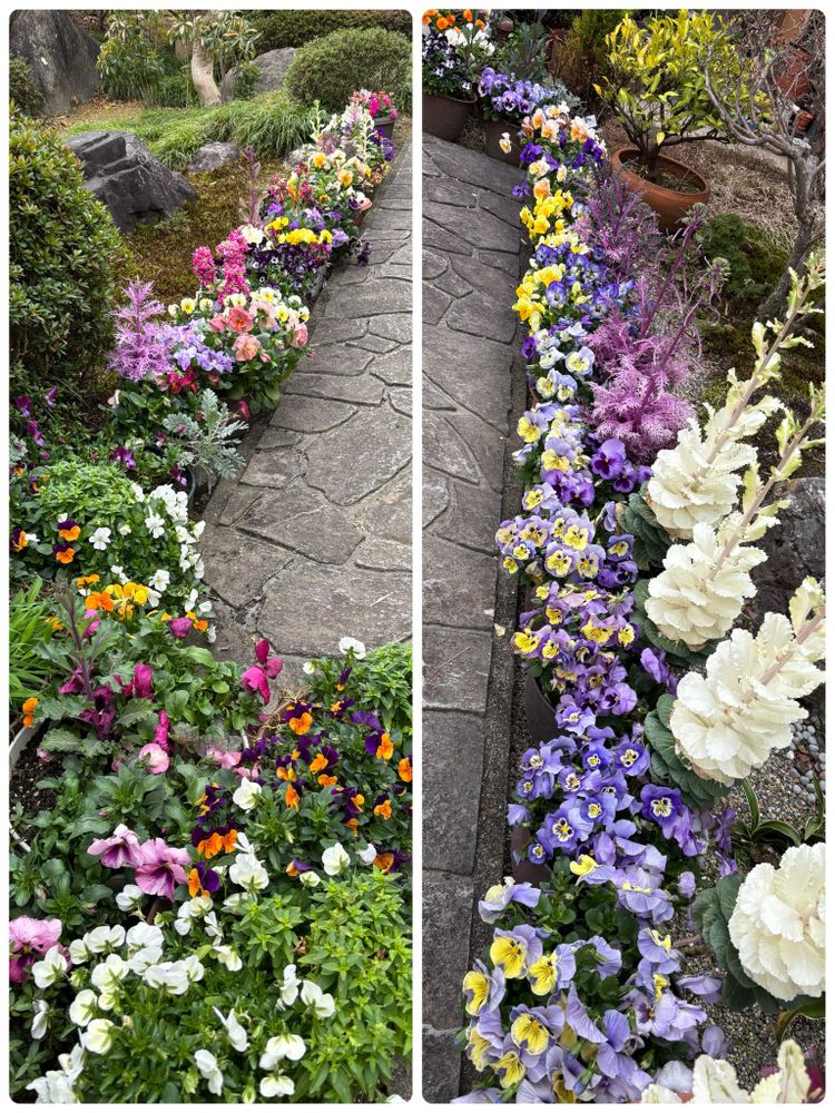 ⑴ アプローチのパンジーがモリモリになりました💕葉牡丹はみるみる花芽が出て来て林が出来ています😅