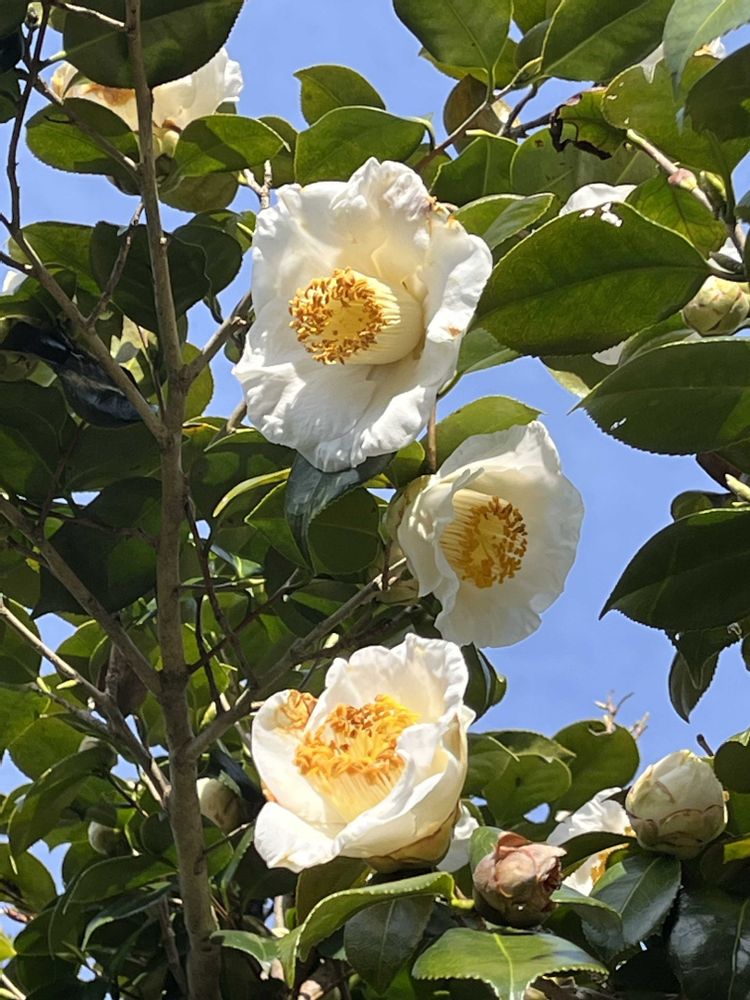 旅から家に戻ったら、白椿が花を咲かせて出迎えてくれました。