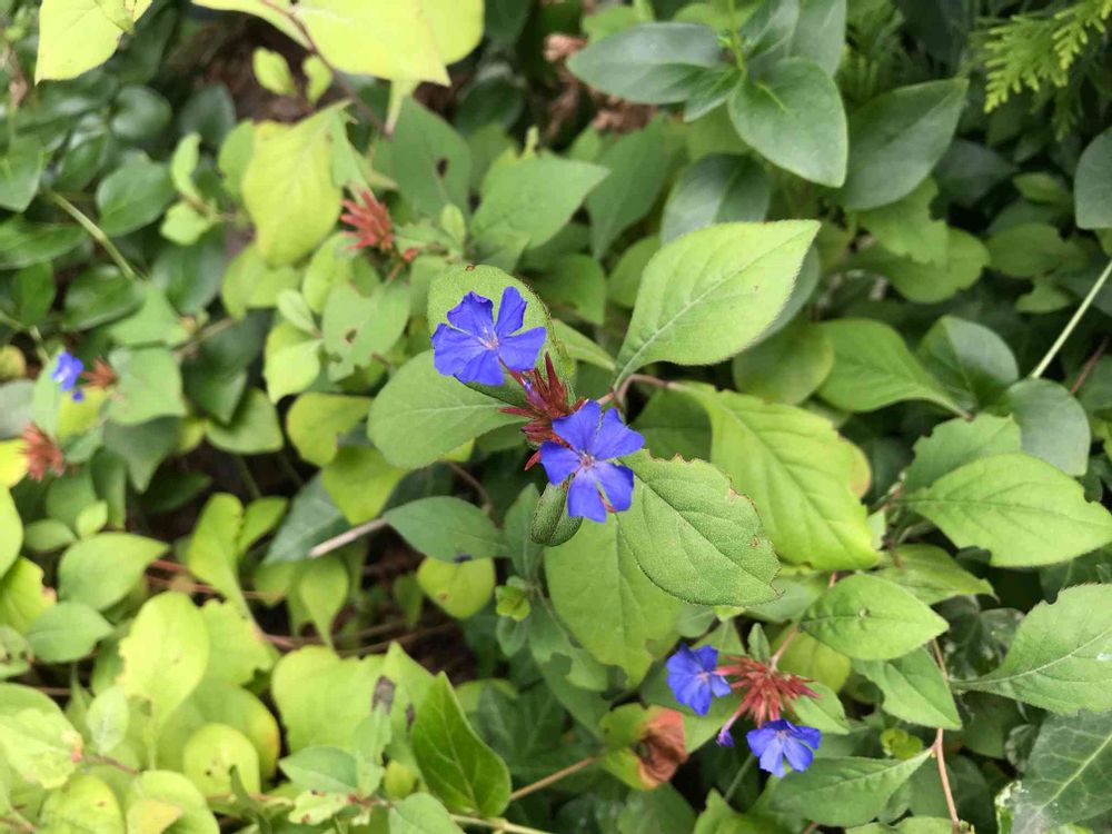 美しいブルーの花色と赤い萼の対比がいいですね❣️寒くなれば葉が紅葉して