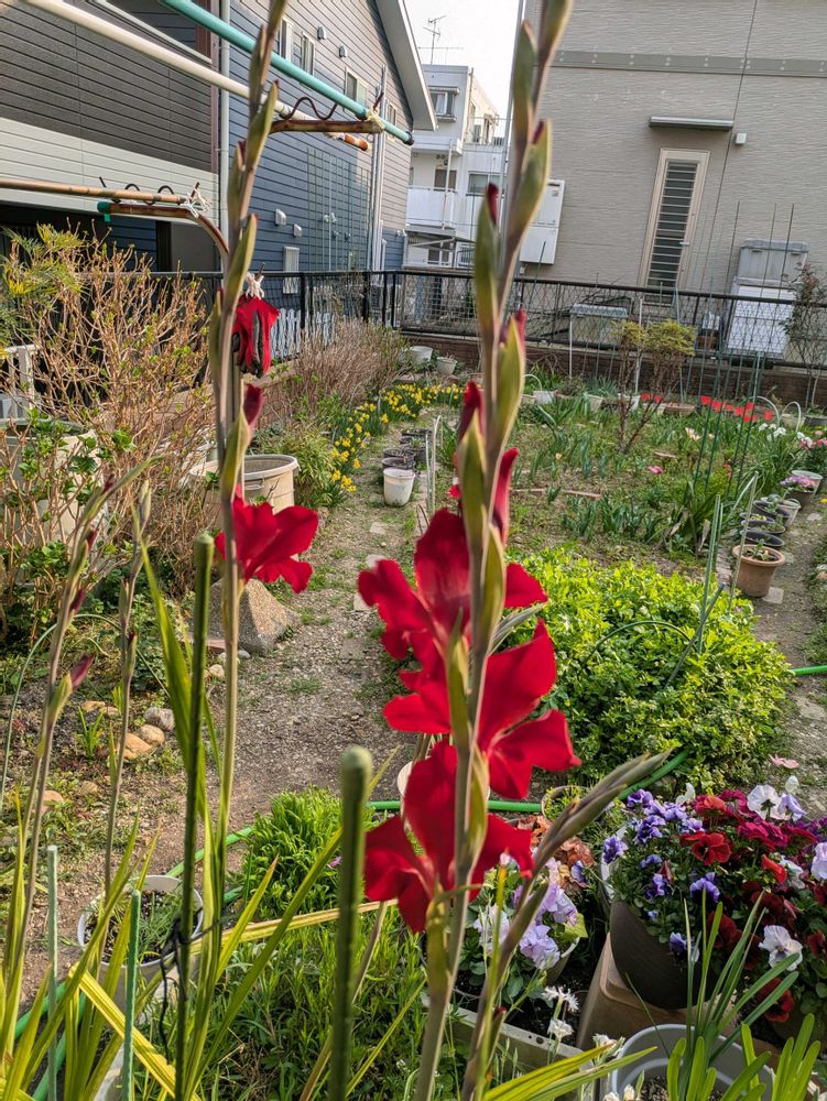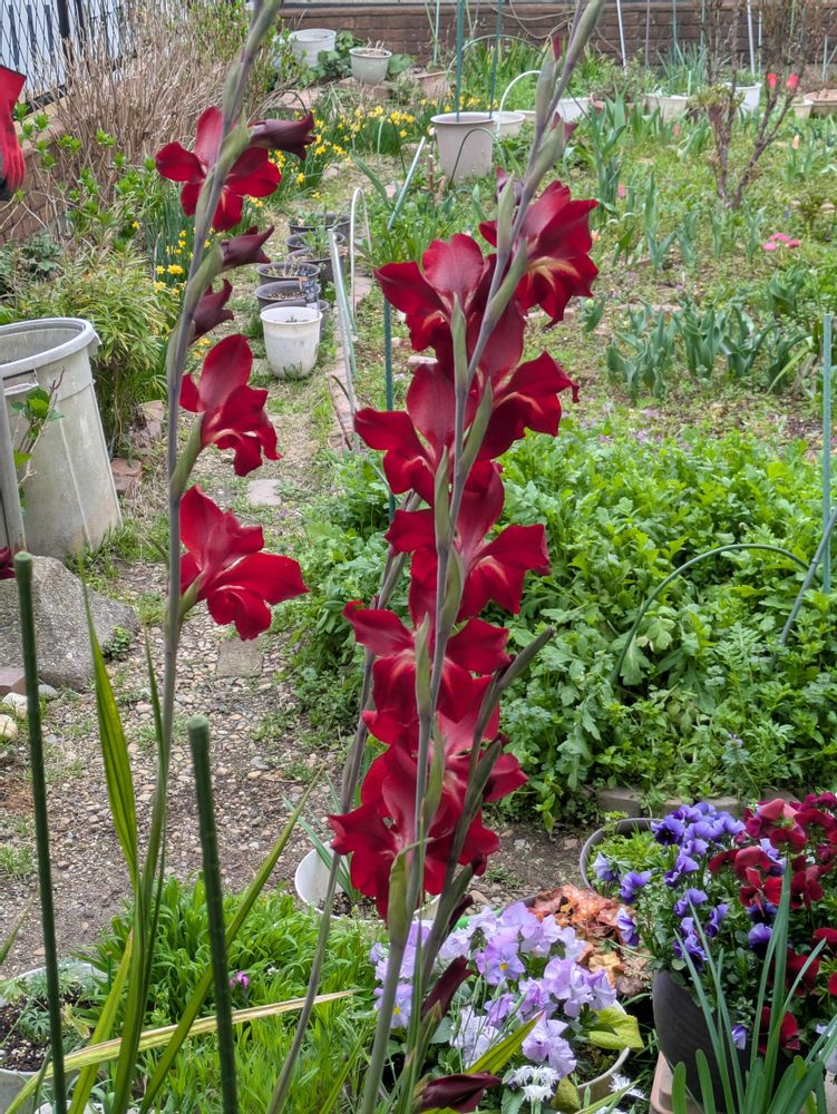 春咲きのグラジオラスが長く咲いてきました。黄色いスイセンは、終わりかけ。
