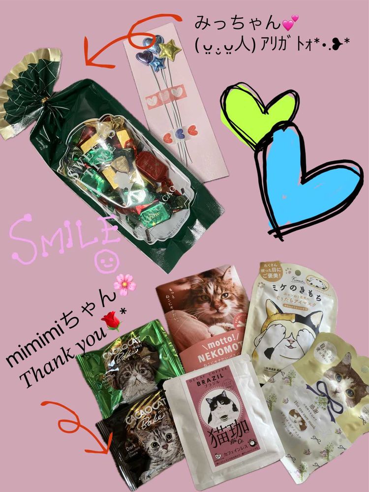 mimimiちゃんからは猫ちゃんpackageの☕、🍪、入浴剤に、アイマスク、ピーチプリデに、秋麗まで💕