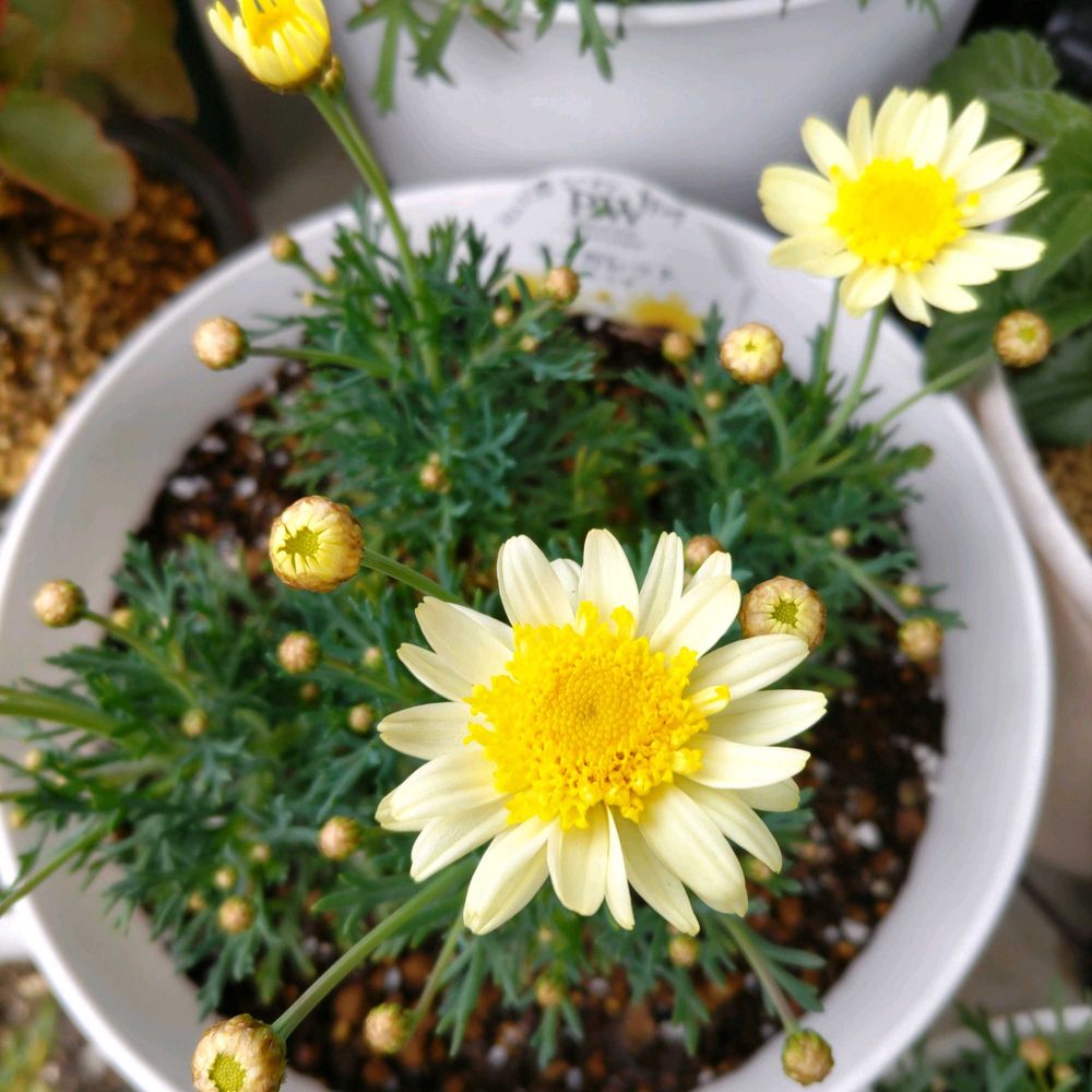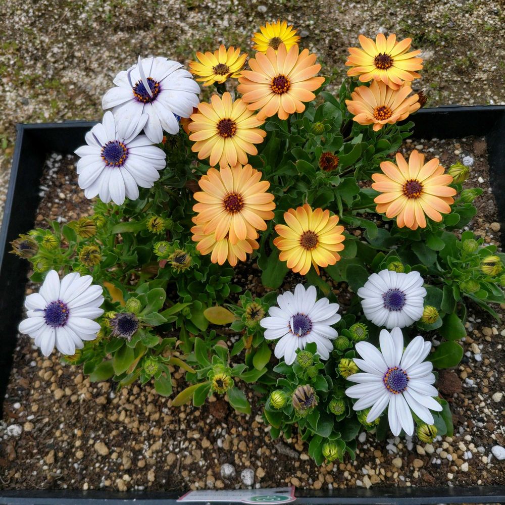 ②オステオスペルマム2色の寄せ植えが徐々に開花してきました