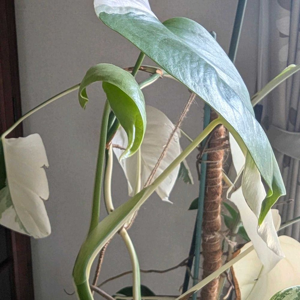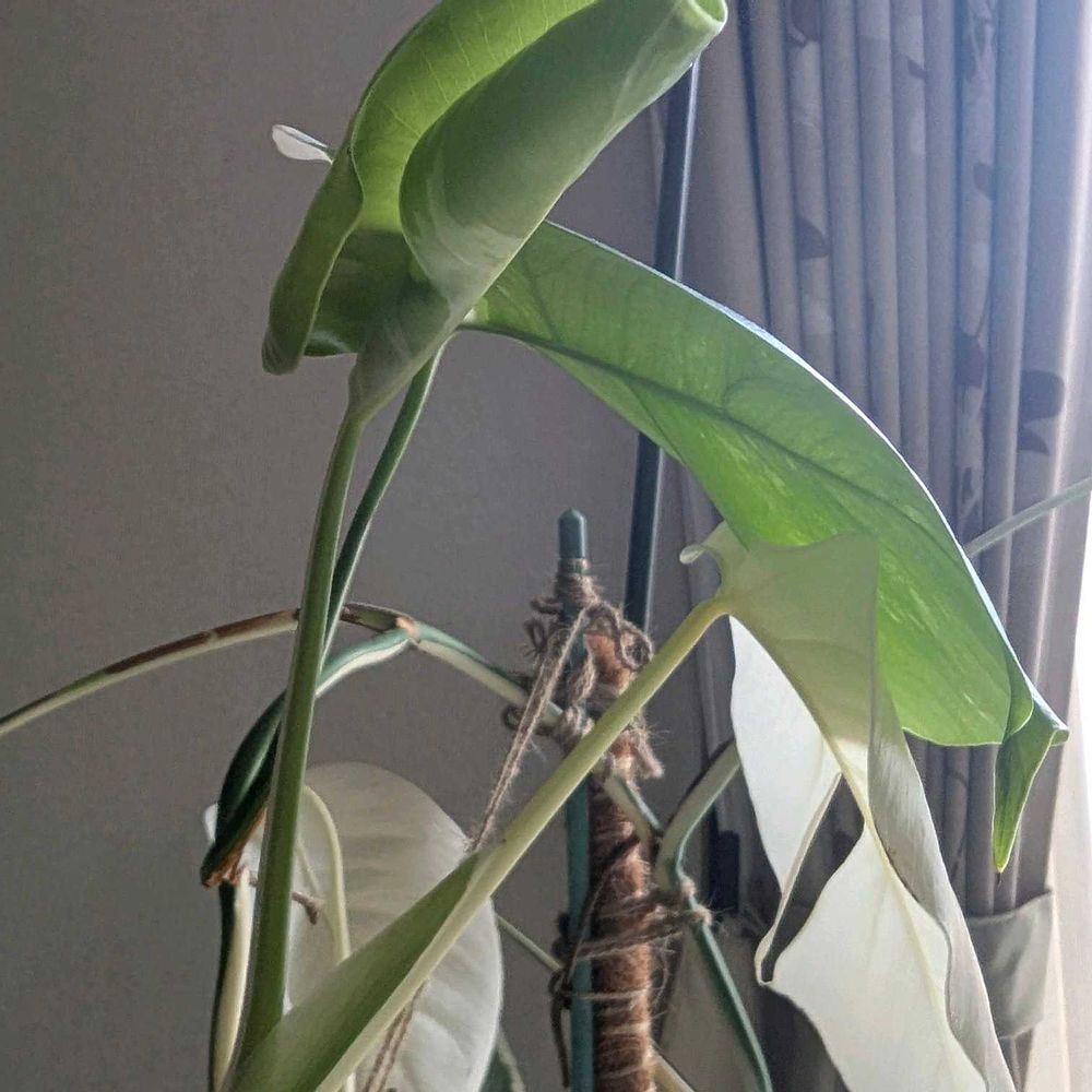我が家のモンステラは茎だけは伸びて、上の方が宙ぶらりんの状態です🤭 麻紐で何とか持ち上げているんだけど、植物ってチャンと上に伸びようとするのね🌿