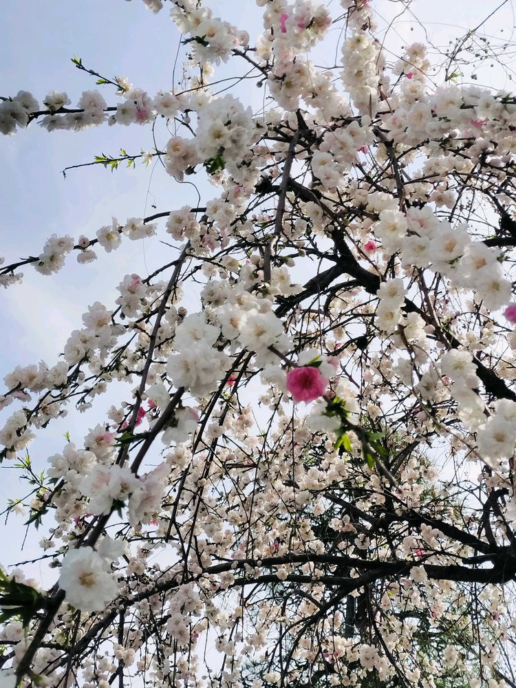 源平咲きの桃の花、綺麗ですね。枝垂れているのも良い雰囲気ですね。🌸🌸🤍🍃