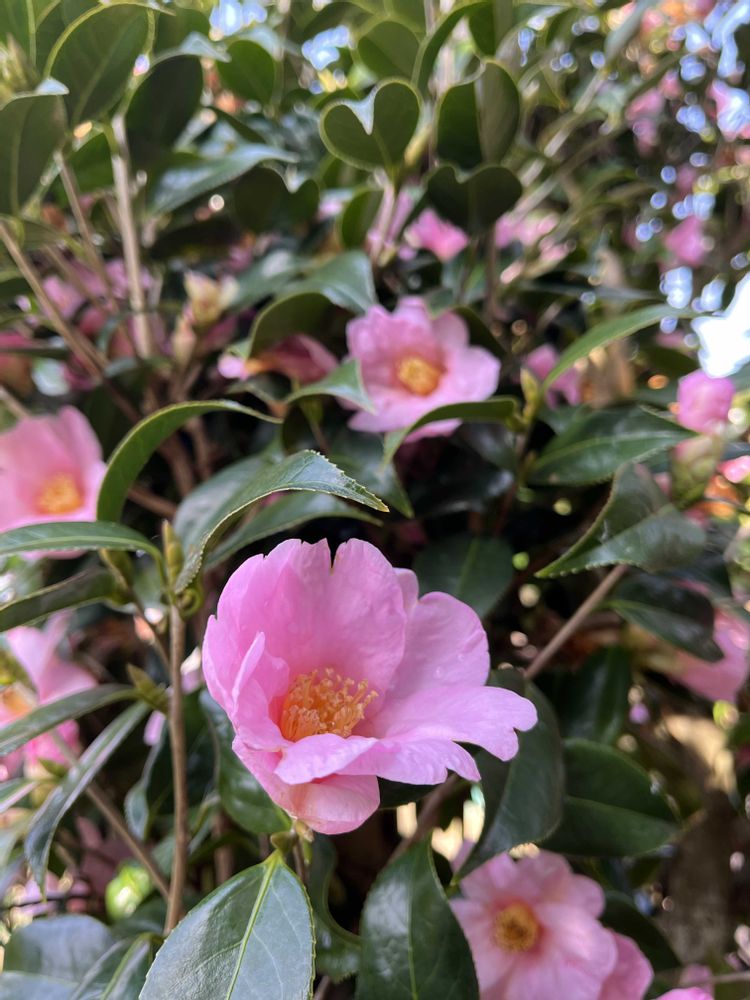 ピンク🩷のツバキ。白ツバキの隣に咲いています。春ですねー、次から次へと開花してますねー♪