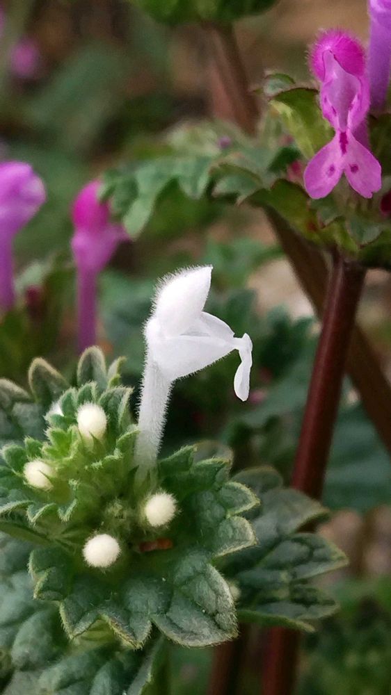 赤紫色のホトケノザの中に一輪だけ白いホトケノザが咲いていました