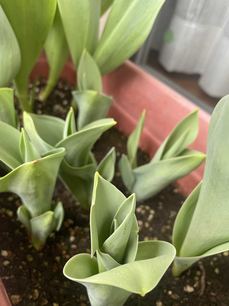 真ん中に植えてる黄色のチューリップ、なかなか咲かない😢