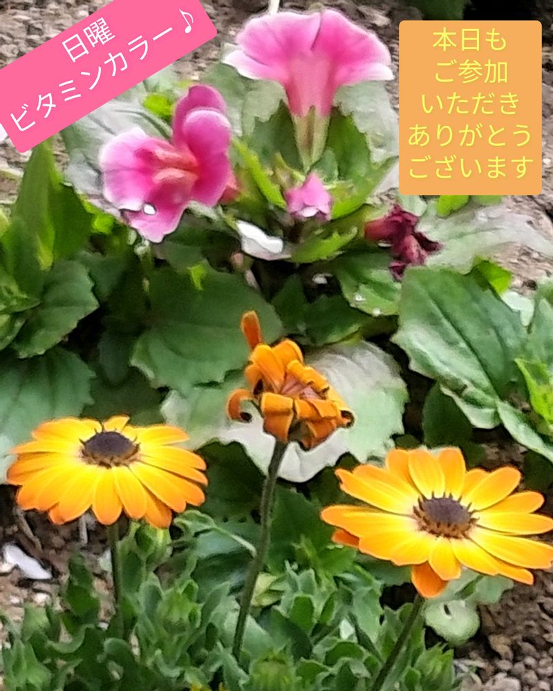 ①ピンク色のミムラスと、オレンジの縁の黄色いオステオスペルマム