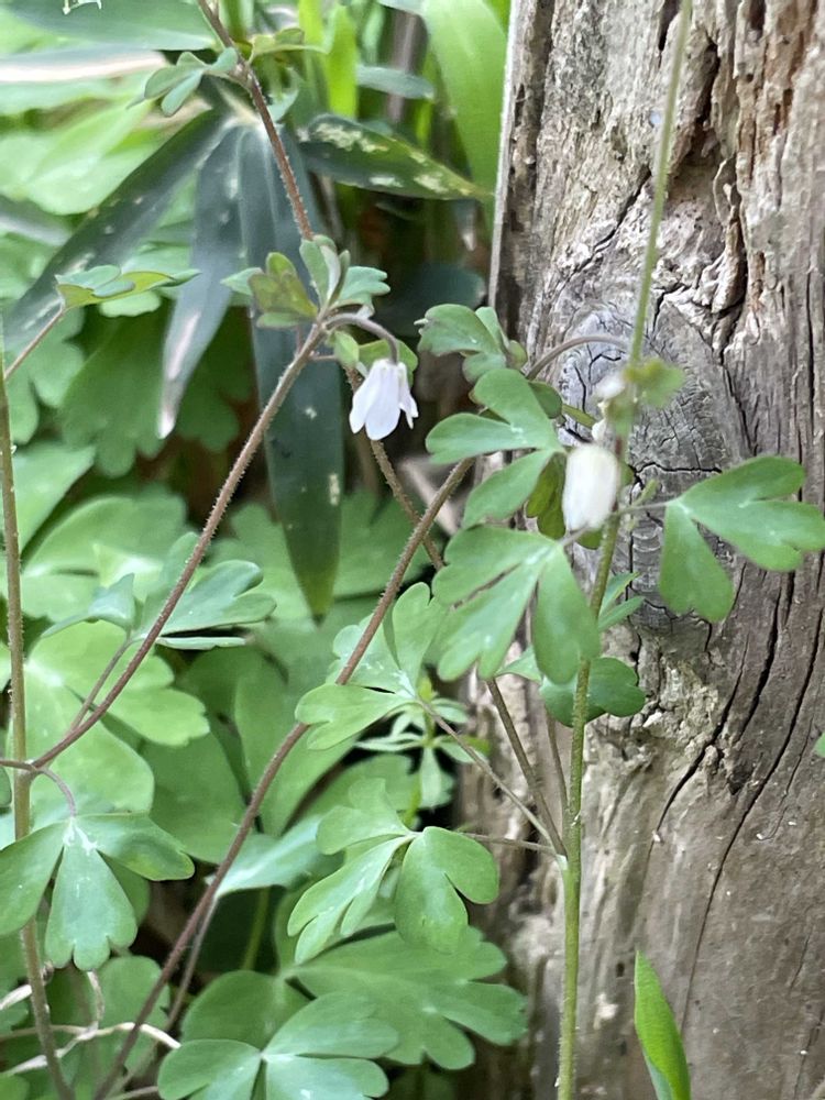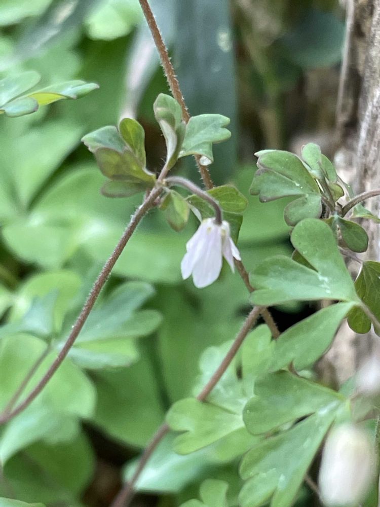 お花見で賑やかな公園の草むらで見つけました。ヒメウズだそうです。俯いて咲いている姿が素敵でした😀