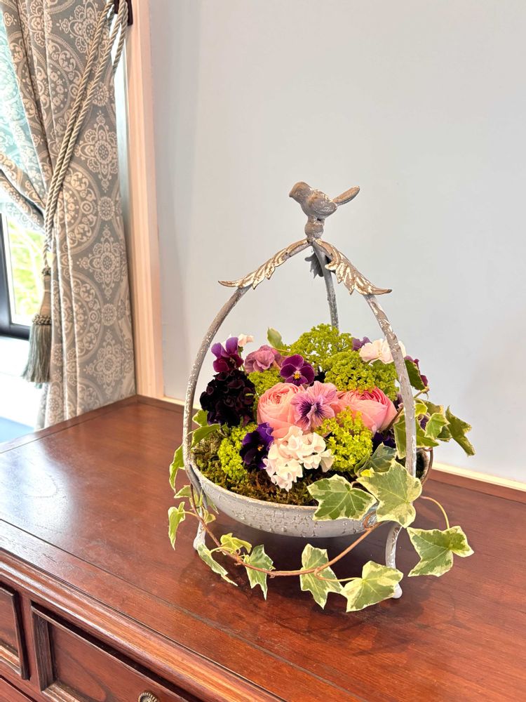 アレンジメントは小鳥🐦の器が可愛くて申し込みました☺️お花が終わった後も再利用出来そうです😆