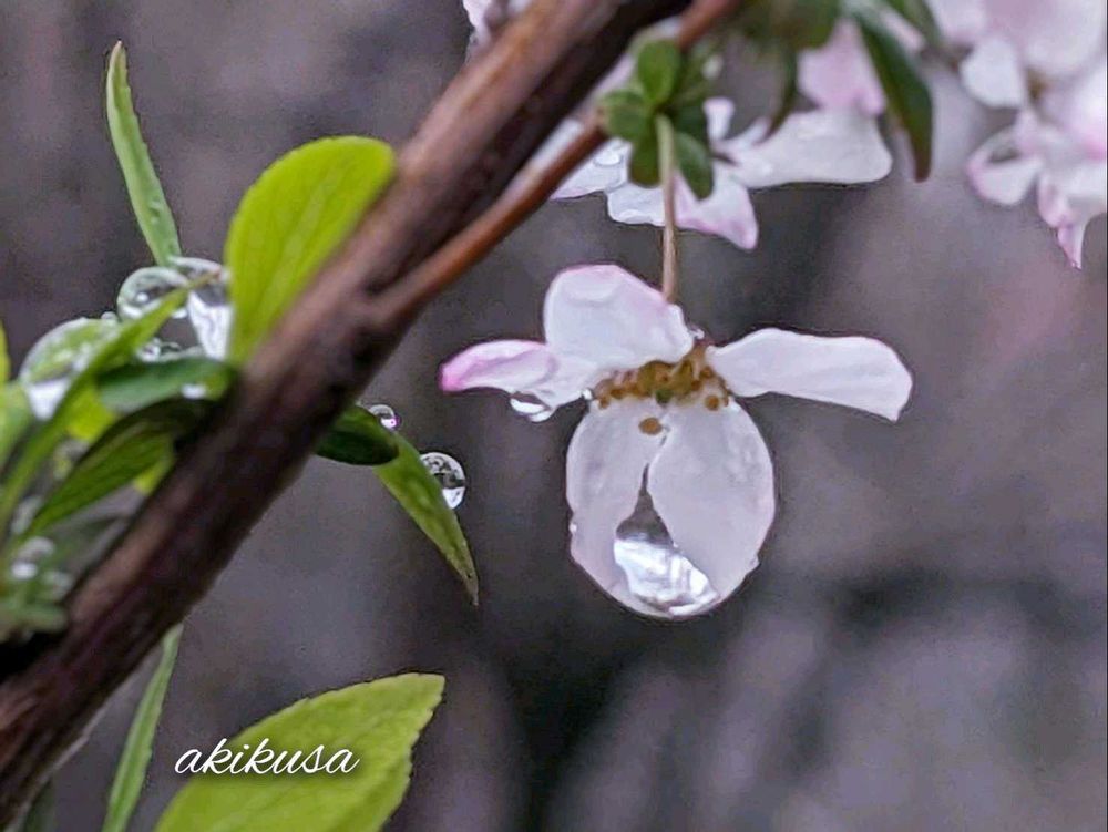 今日は庭中雨粒がいっぱい ピンク雪柳にも… 雨粒が大好きなので沢山撮った中の1枚です