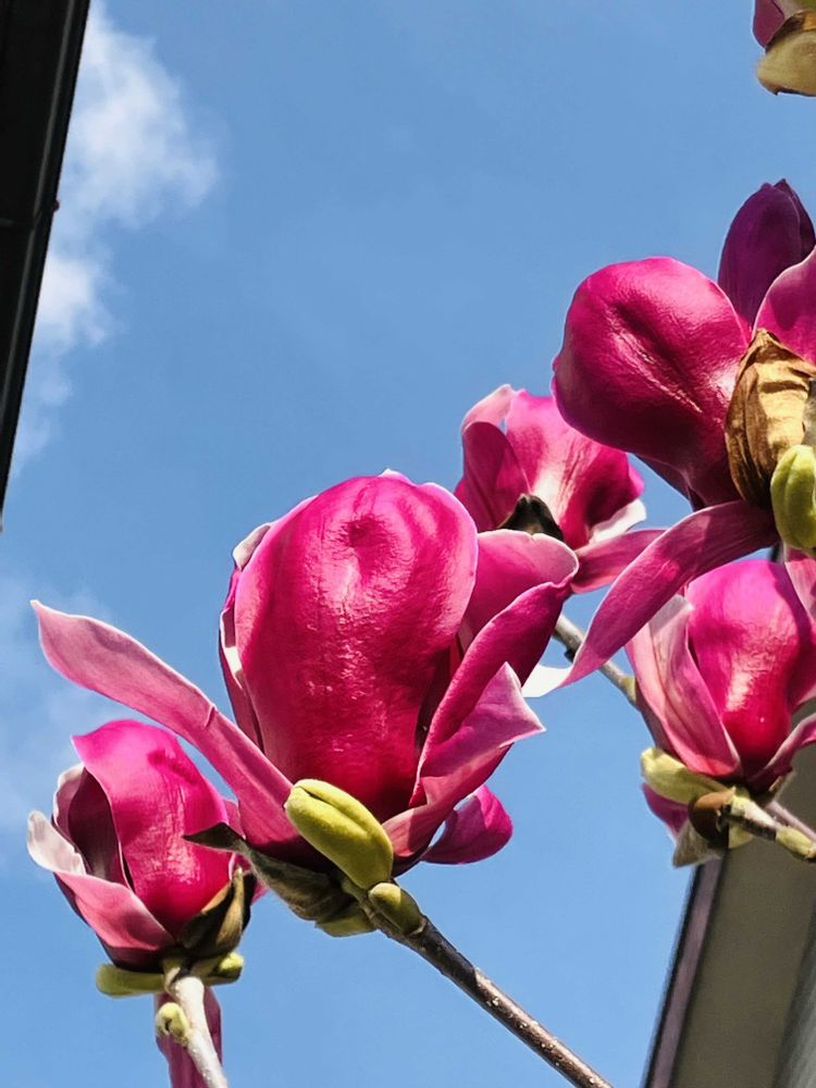 木蓮、濃いピンクが青空に似合いますね💕