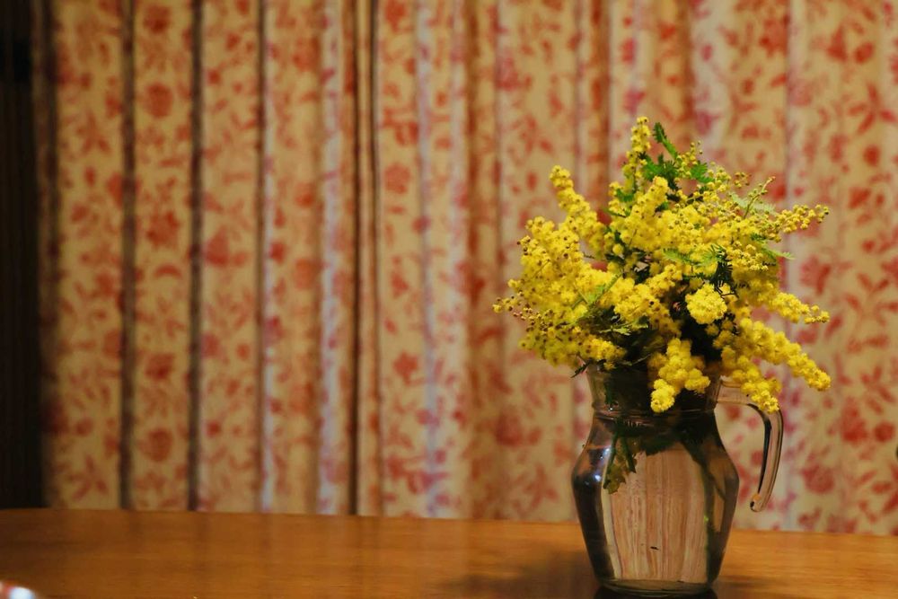 カーテンとミモザ‥オシャレ感が素晴らしいです👍 映画のシーンみたいです。
