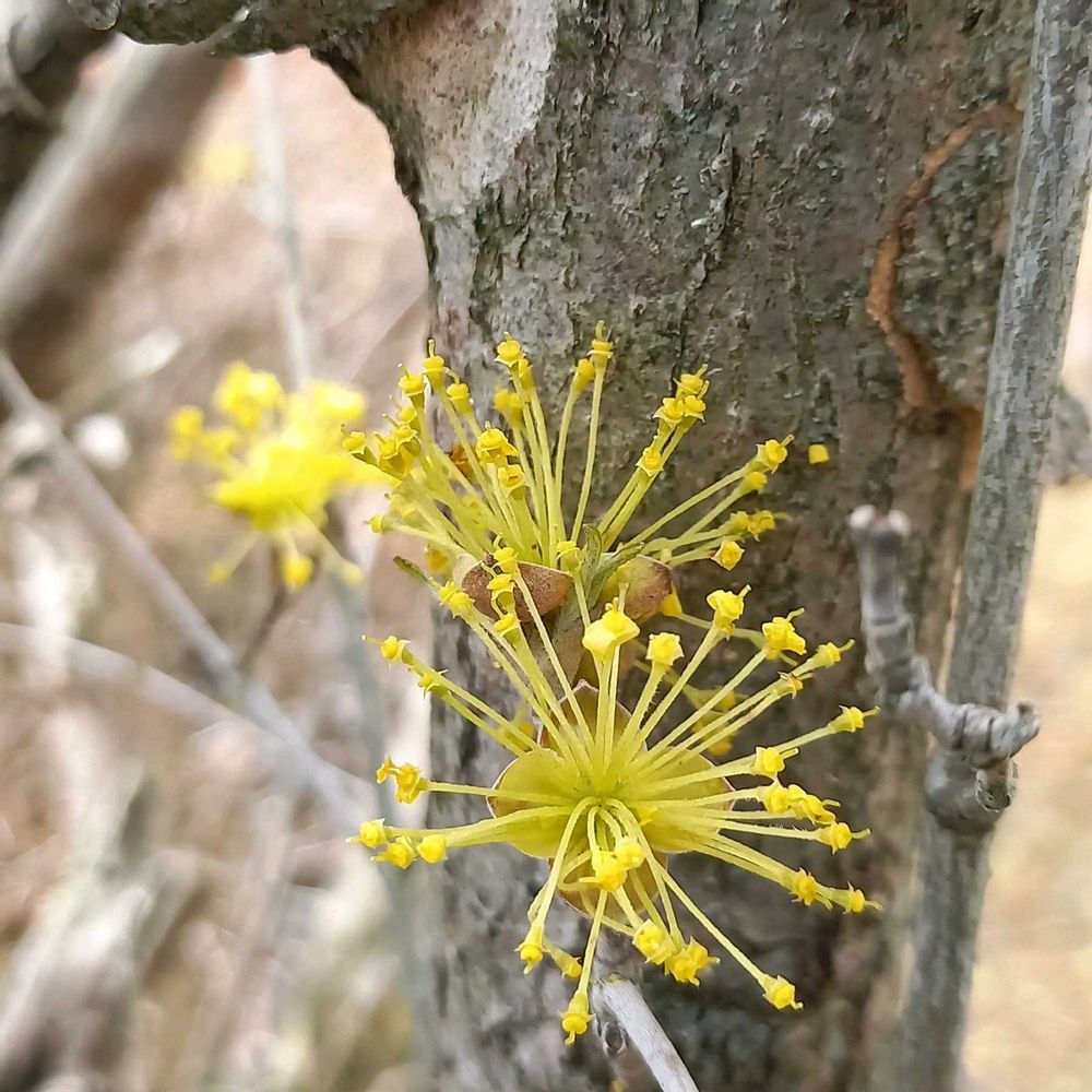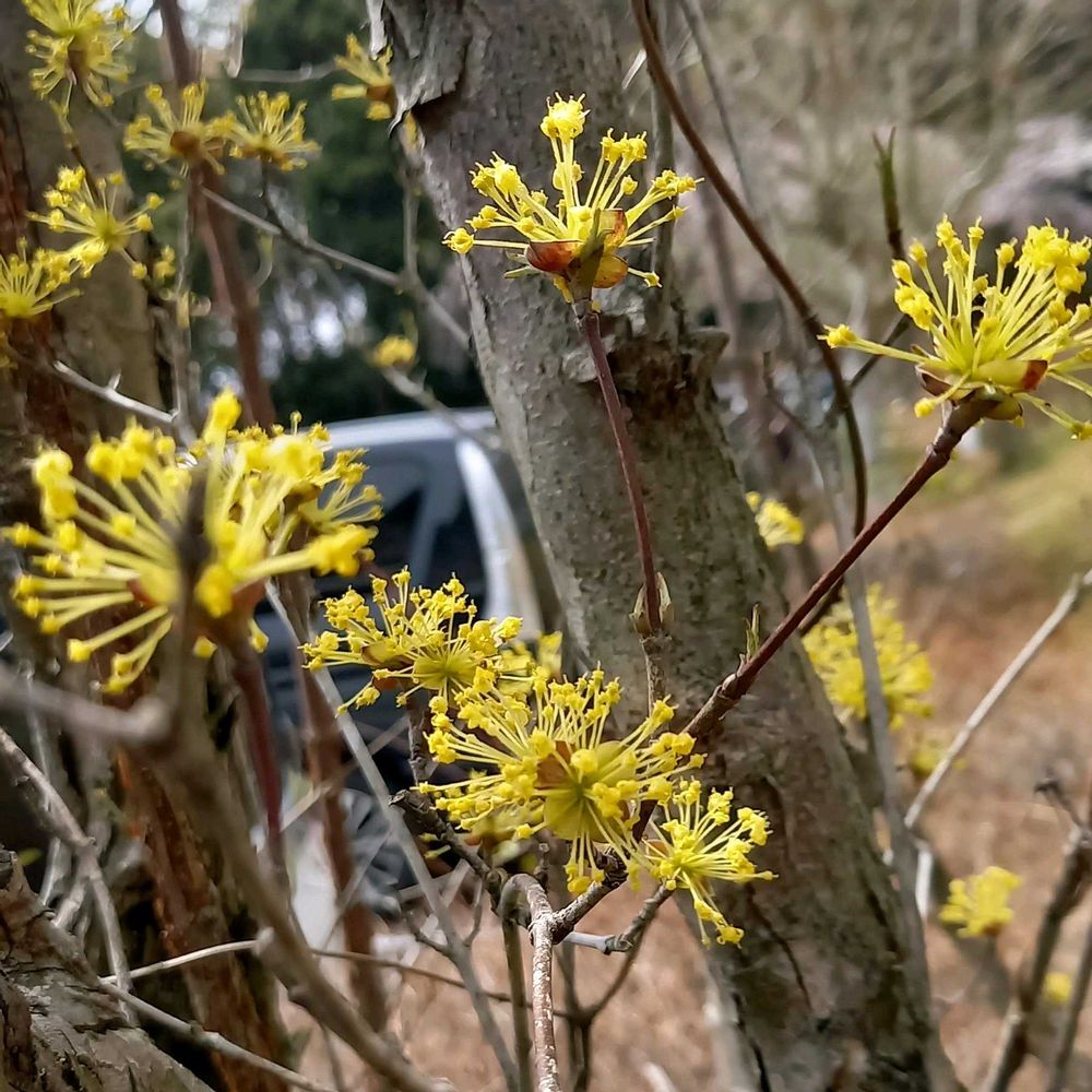 遠目にマンサクにしてはちょっと遅いし……と思いながら近づくとサンシュユでした。駐車場の脇に数本植栽されていました。