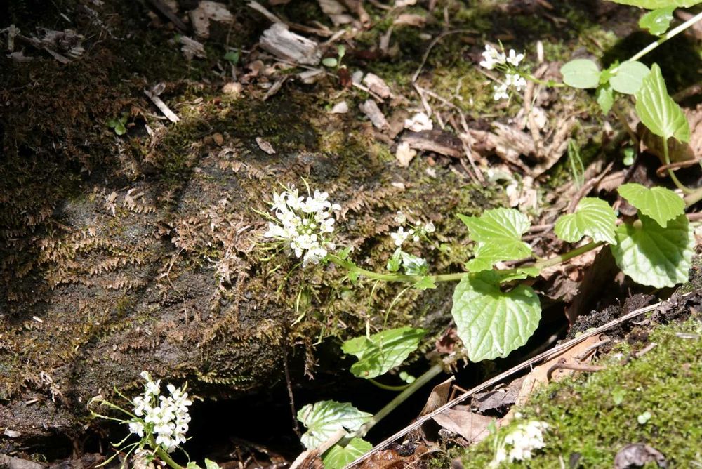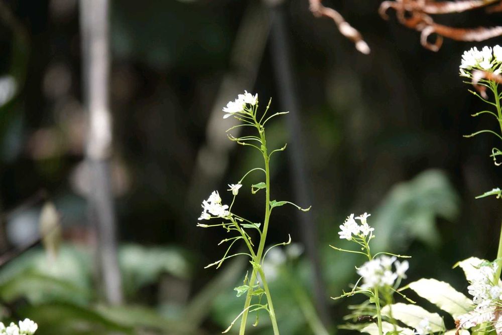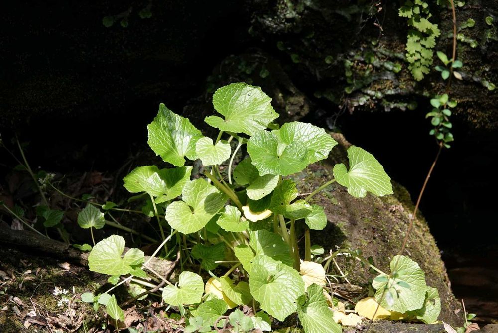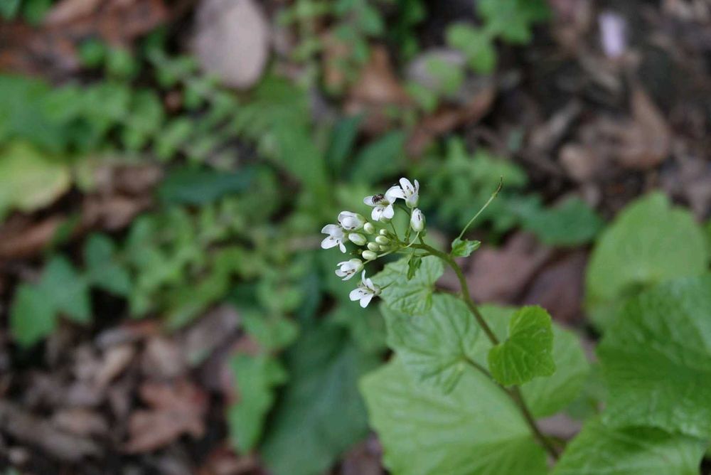 根生葉は直径6~12㎝のほぼ円形で、基部は心形、縁には波状の鋸歯があり、長さ10~20㎝の葉柄がある。茎葉は互生し、小型の三角形。花茎は直立し、総状花序に花を多数つける。花は直径約1㎝の白色4弁花。雄しべ6個。(三河の植物観察より抜粋引用)