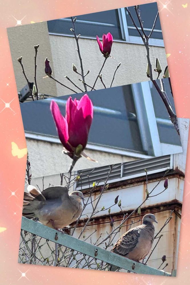 仲良しキジバトさんたちと紫モクレン!