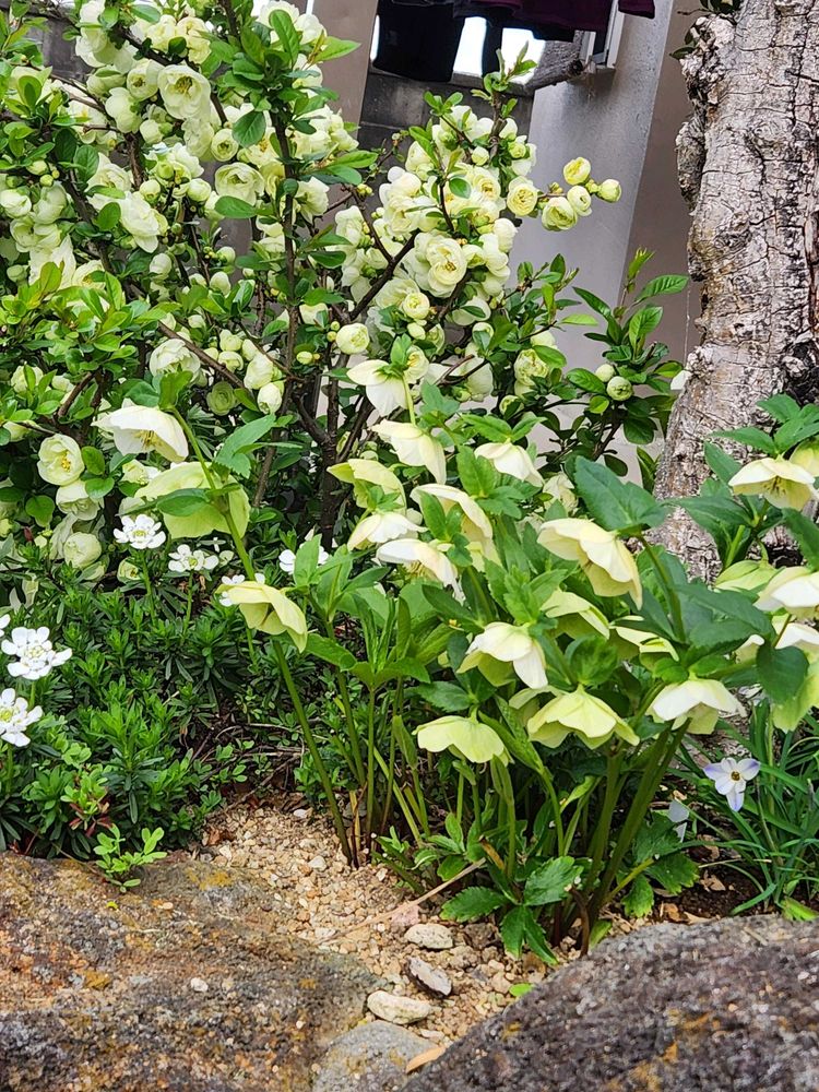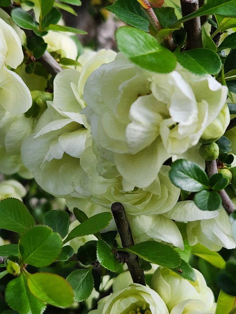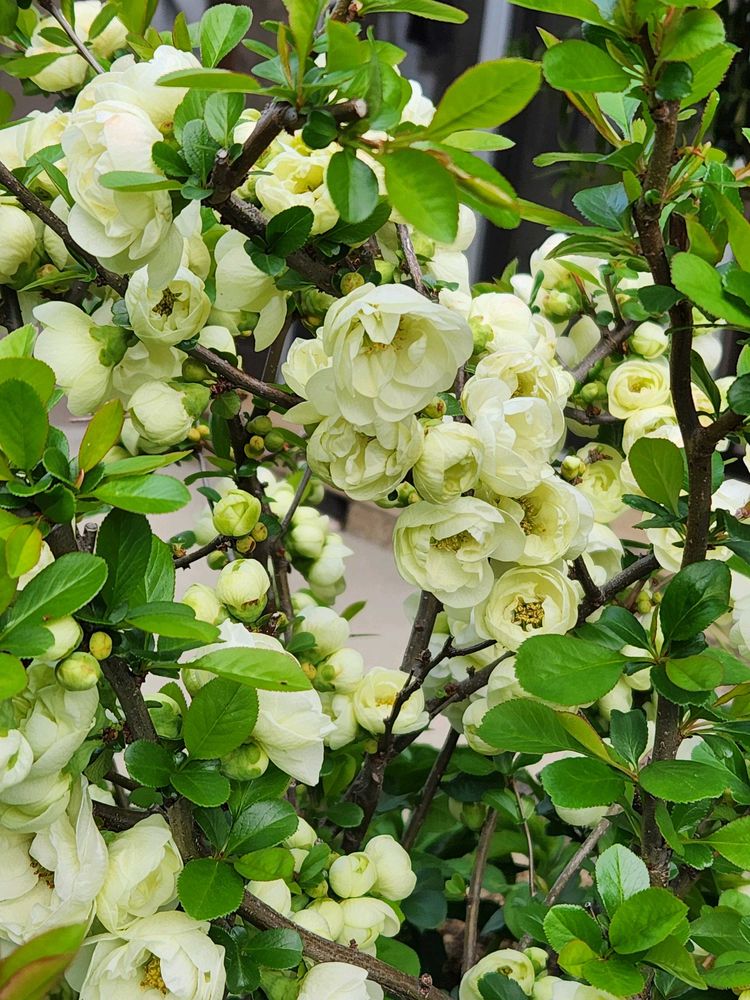 友人の庭に白い八重咲きの「ボケ」の花が見事に咲いていました。