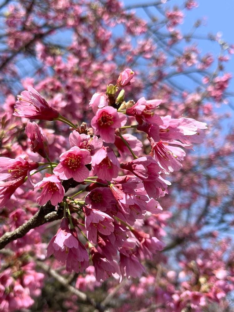 花は釣り鐘状の下向きに閉じたような半開きの形で咲き、濃い紫紅色の花弁を付けるのが特徴です。沖縄ではこの寒緋桜のサクランボを食べるそうですよ。