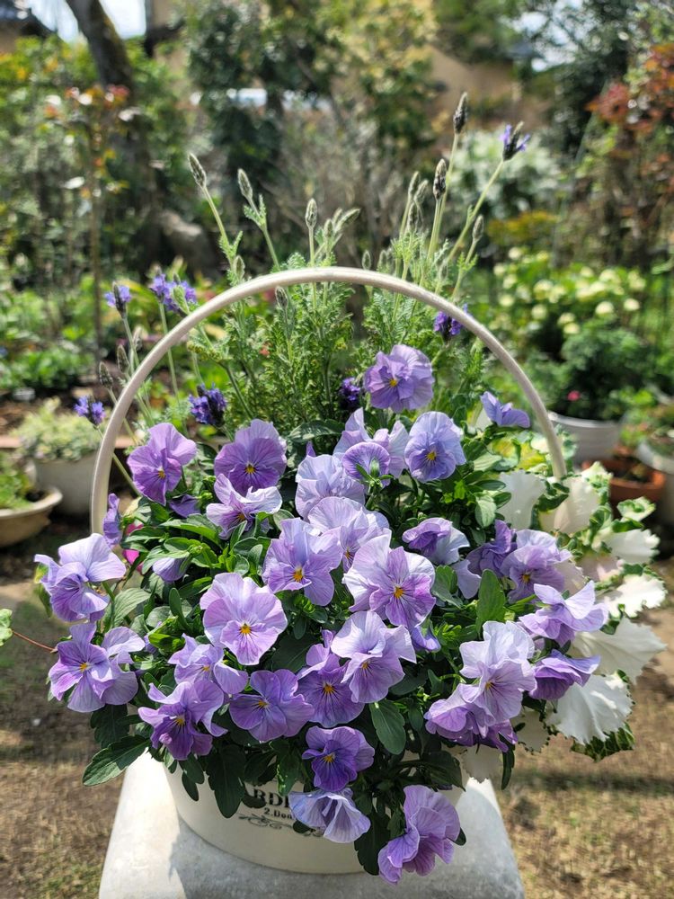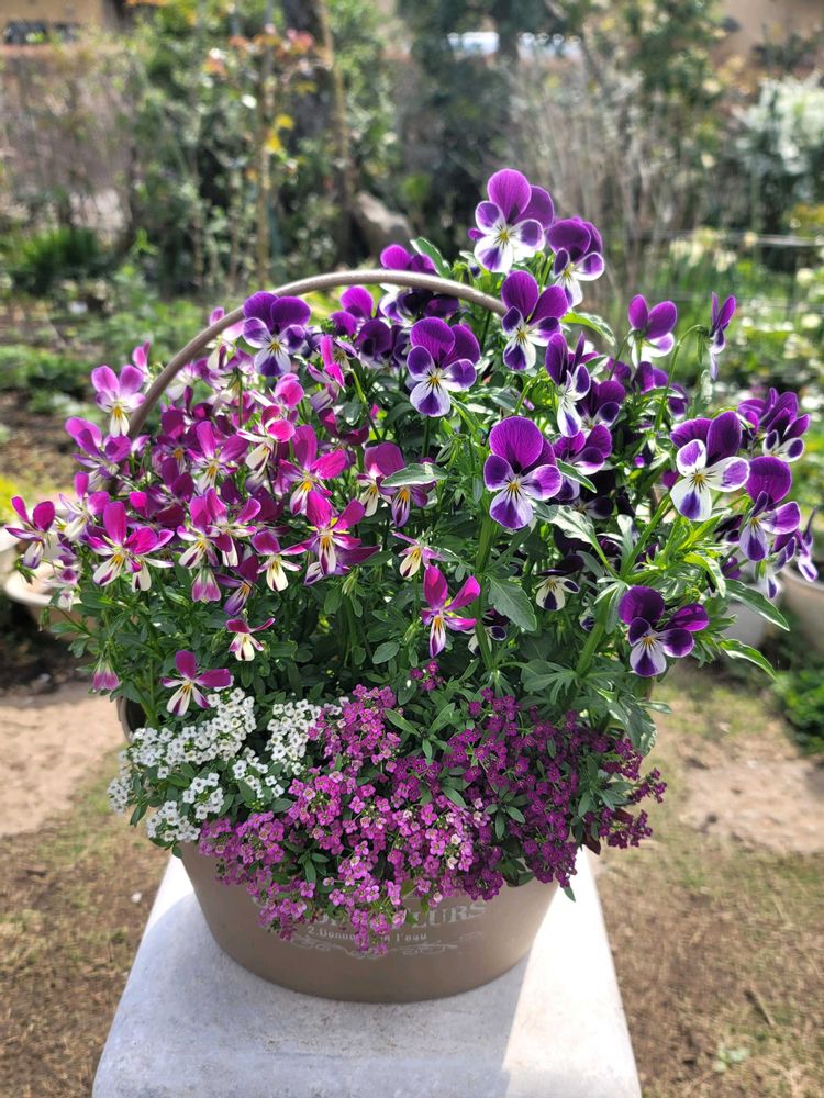 パンビオや絵になるスミレまたウサギさん🐰アリッサムもモリモリで華やかですね🤍🩷💜