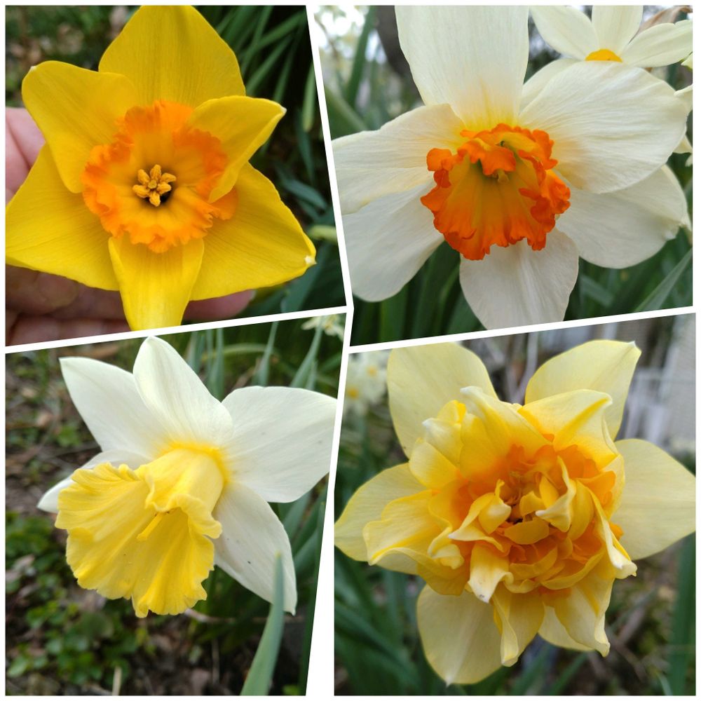 上二つは口紅スイセンで、左下がラッパスイセン、右下が八重咲きですかね😅