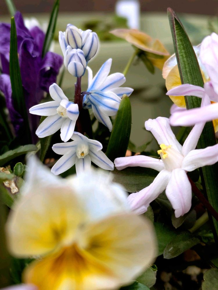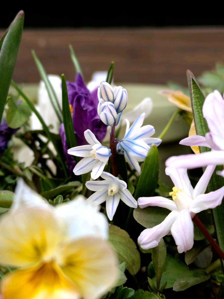 クロッカス、チオノドクサ、プスキニアのミックス球根全て咲いてくれました。春が来た感じがしますが明日は雪の予報です…