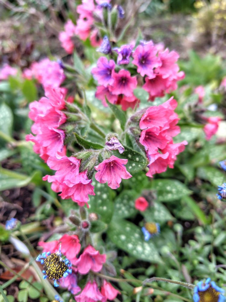 水玉模様の葉が特徴的なプルモナリアです。このコが咲くと春が来たなーっと実感します🌸