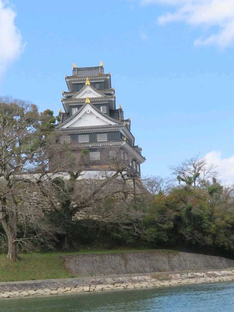 旭川沿いに建つ岡山城の天守は黒漆塗りの外観で、別名「烏城(うじょう)」と呼ばれ、壮観でした(②)。