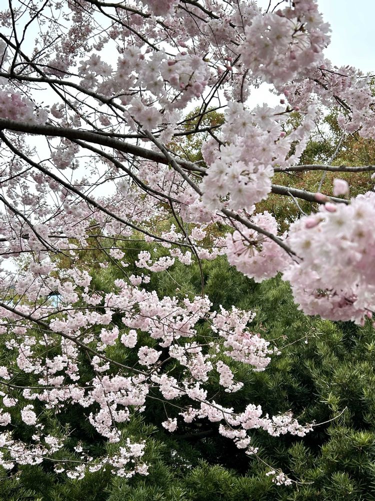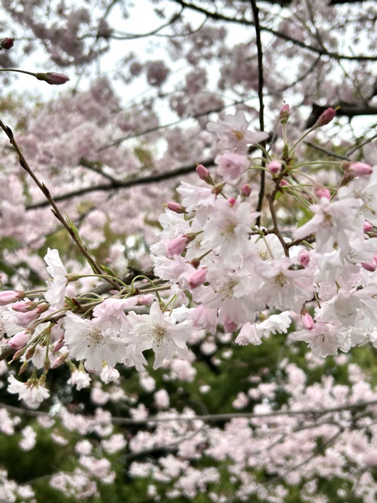 さん、ソメイヨシノ並木の中で、人混み、皆んなスマホ向けてる、何かと思ったら舞姫でした🤭ソメイヨシノより濃いピンクなので目を惹きます🥰