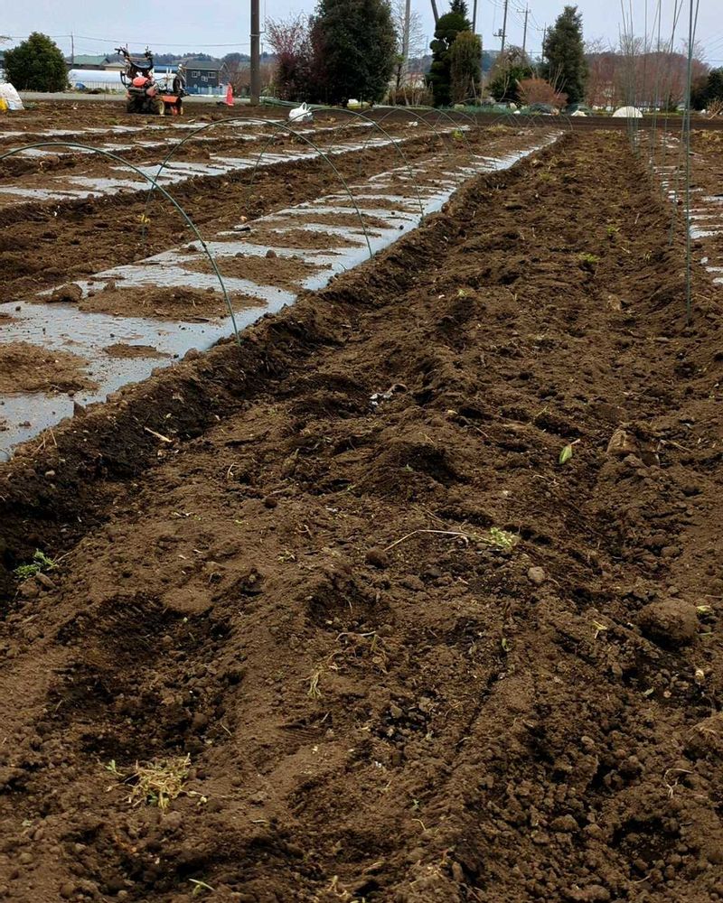 種まいたあとは、曲がるアーチを畑に刺して、腕編みした、トンネルビニールを、また、解いて、アーチにかけて、両側から土をかけます。