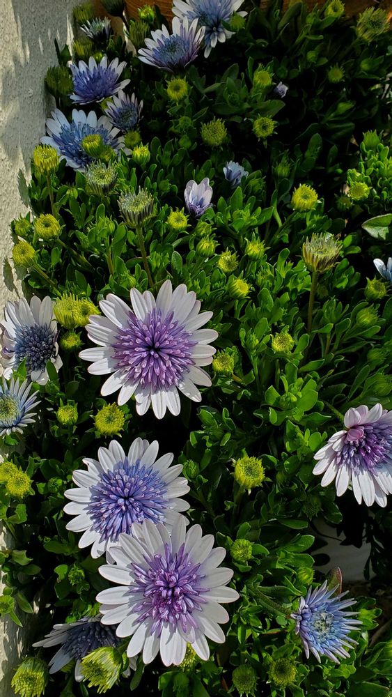 庭の手入れをしていて、オステヲステルマムが、家の壁際に くっついているので退かそうとしたら、鉢から根が出て、しっかり土に埋まってしまいました。昨年に頂いて夏ごし、冬ごしできたら、こんなに立派になりました。
