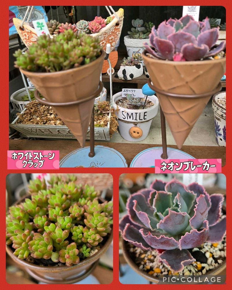 リサイクルショップで見付けた🍦コーン鉢にセダム・ホワイトストーンクラップとネオンブレーカを植えました😊買った時はもっと紅葉🍁していたような?🙄