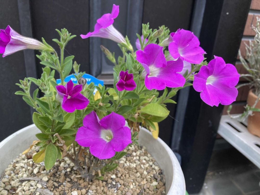 冬越し株の三番目はこの子です。ペチュニアの仲間では一番遅い開花になりましたが、元気で冬を越しました。若干冬の寒さでエネルギーを消費したので元気が不足していますが、暖かくなれば元気になるでしょう。昨年に引き続き全鉢冬越しは成功しましたので、この辺りの気候ならば軒下に置けば定期的な水やりだけで冬越しが可能であることを確認しました。パンジーの終わる5月下旬には主役として玄関先で頑張ってもらう事になります😊。