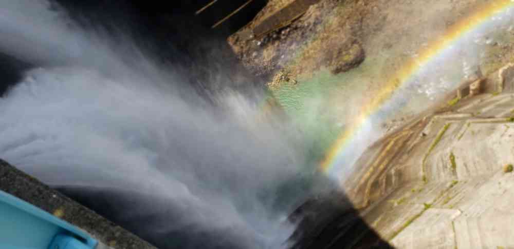 黒部ダム、通称「くろよん」の観光放水とそれに架かる虹🌈