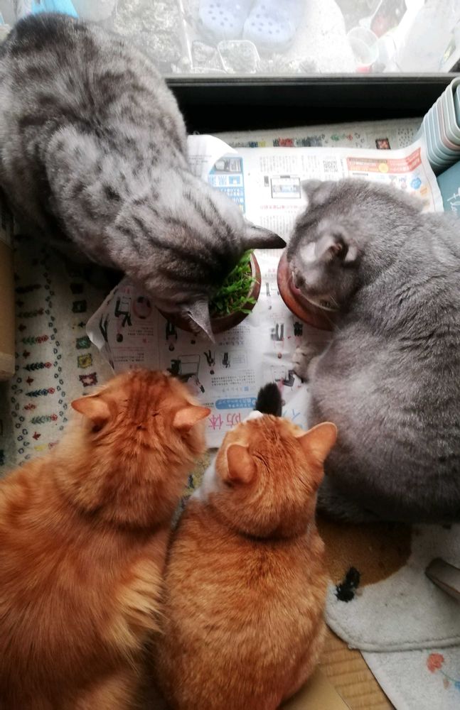 朝一猫草タイム 一度に5匹は なかなかシャッターチャンスないの 😢
