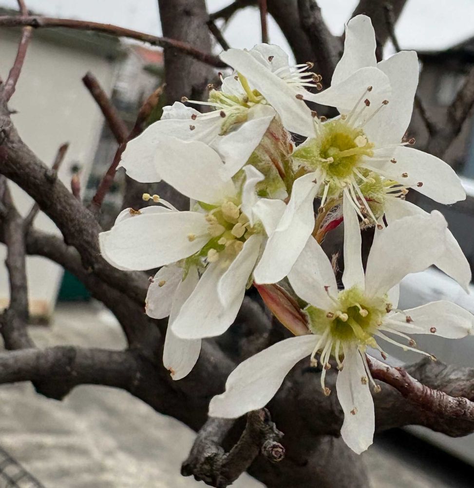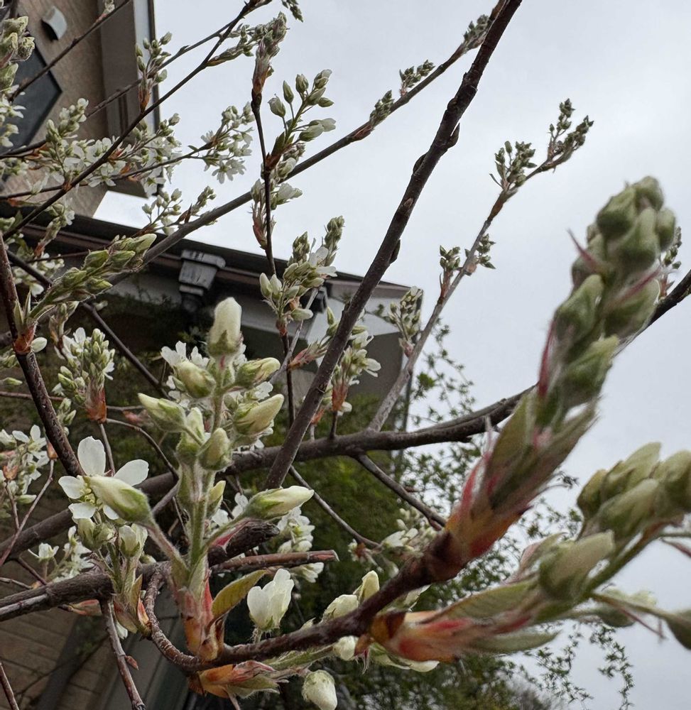 3️⃣4️⃣⭐️ジューンベリー まだ蕾多いが、お花が咲き出して、葉が無いのにこの白い🤍モフモフが可愛い💕昔はいっぱい実がなってジャムも作ってたが、最近はブラックベリーの方が実がなるかな😊