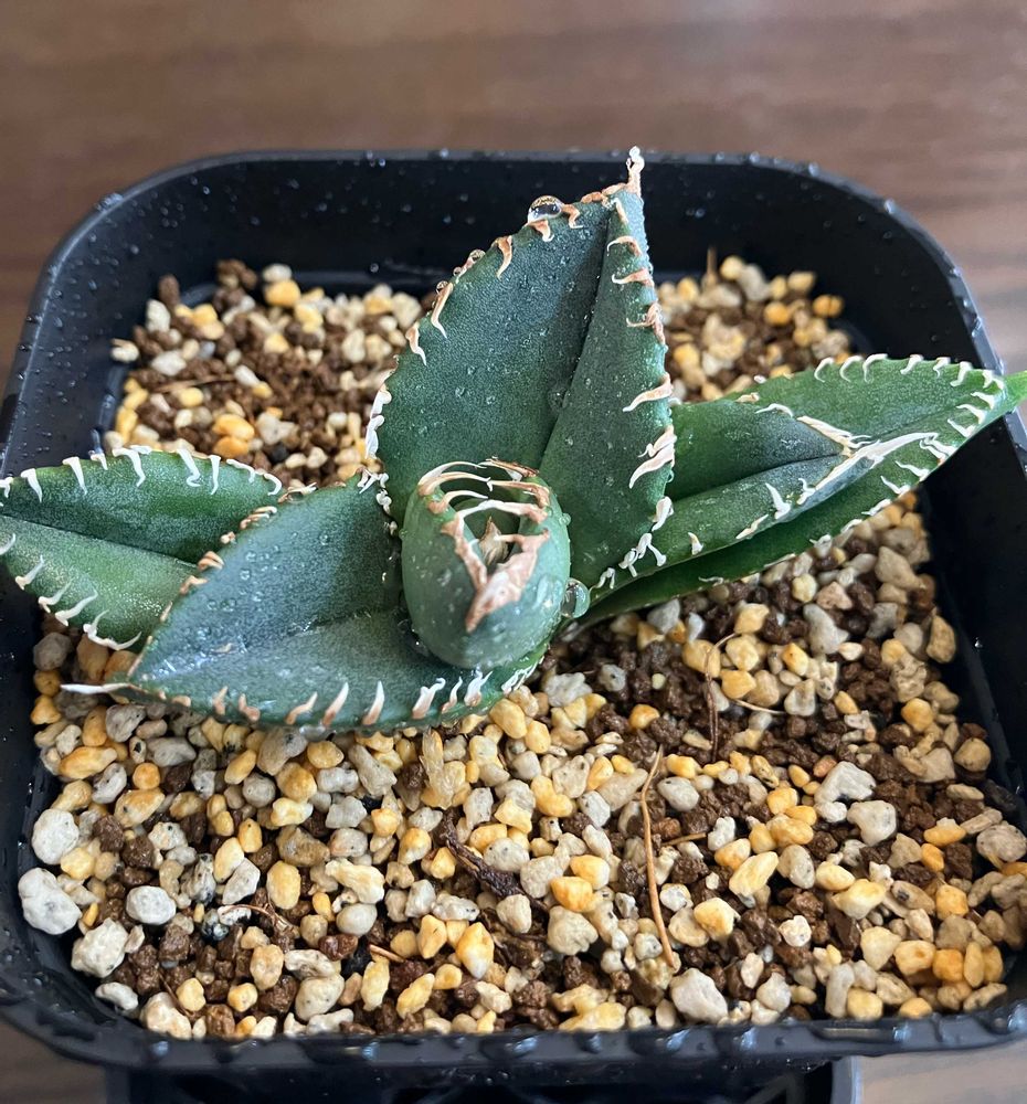 アガベに興味持った昨年10月にヤフオクでネギ状態の抜き苗をお迎えしてやっとこの大きさになりました〜